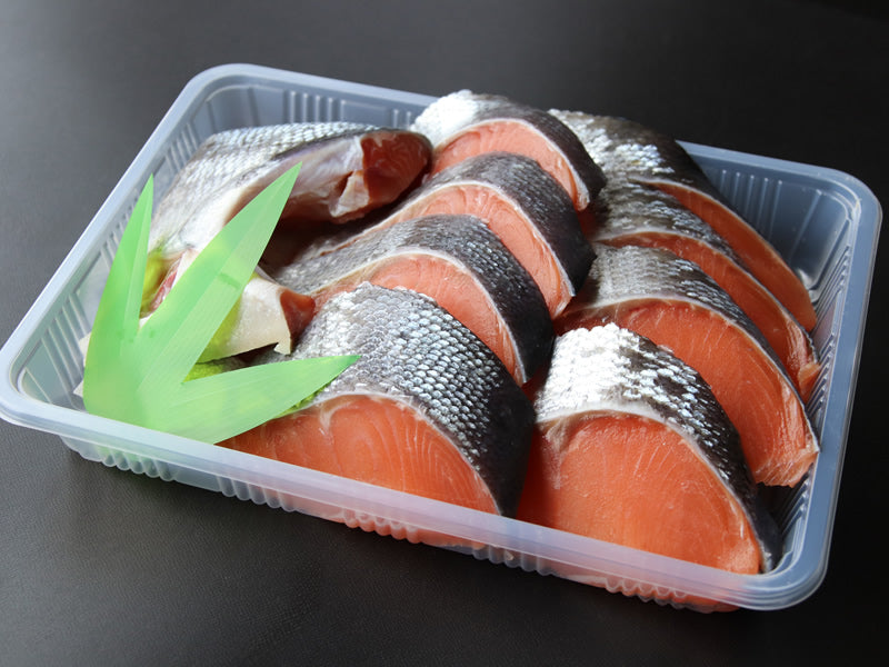 片側の半身を切り身に、もう半身は骨付きで切身に。鮭の旨みを余すところなく楽しめる。(頭付き)