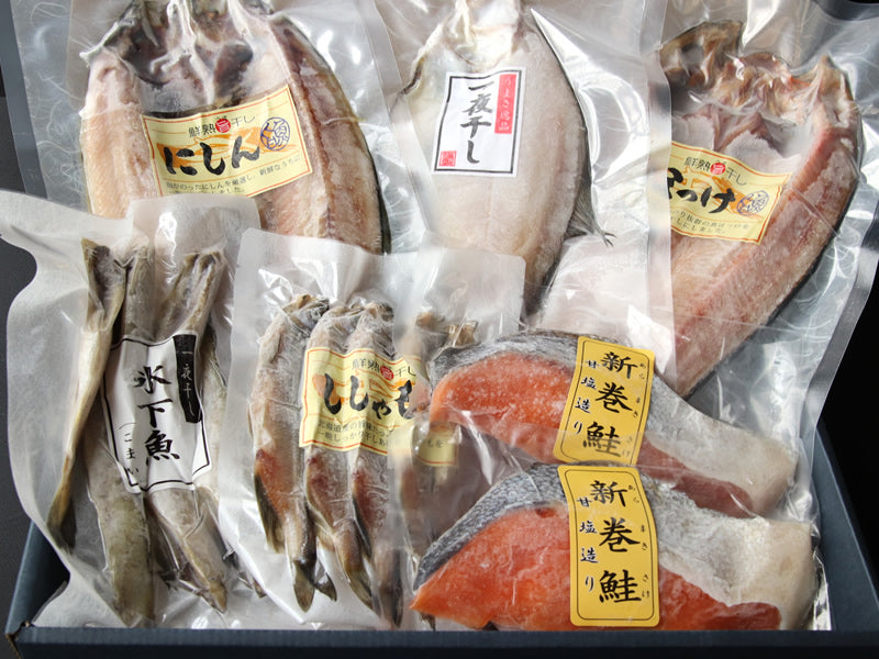 ・にしん開き(1枚) ・宗八かれい(1枚) ・こまい一夜干し(100g) ・ししゃもオス(5尾) ・新巻鮭甘塩造り切身(2枚) |